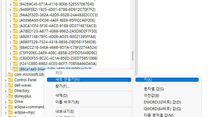 2) 아래 경로로 이동 하여, 키를 생성하여 '{86ca1aa0-34aa-4e8b-a509-50c905bae2a2}'를 입력한다.