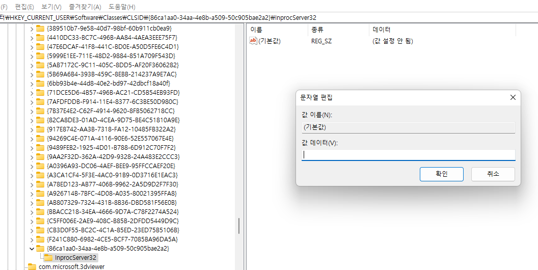 4) 'InprocServer32' 해당 경로에서 기본값을 더블 클릭하여 입력하지 않고 '확인' 버튼을 클릭한다.