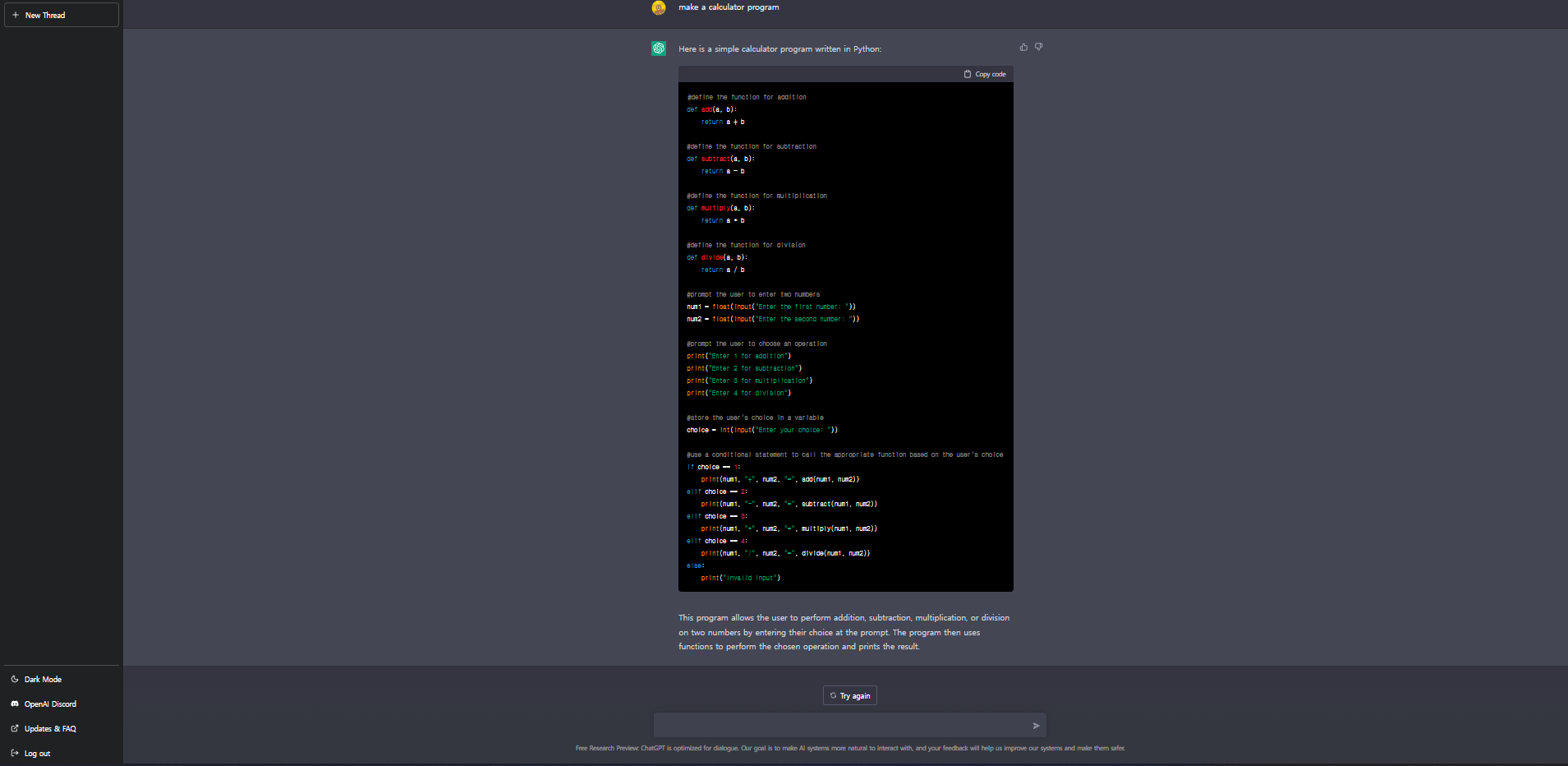 아래와 같이... 기본 언어가 파이썬인 것 같다... 파이썬으로 계산기 프로그램을 만들어서 줬다...