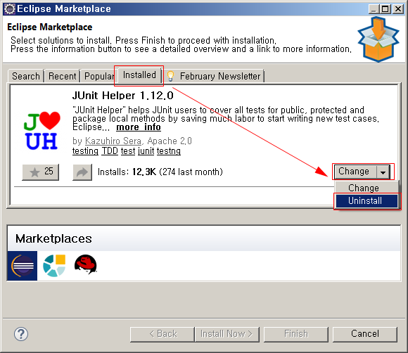 2. Eclipse Marketplace - Installed탭 설치된 플러그인 선택 후 삭제
