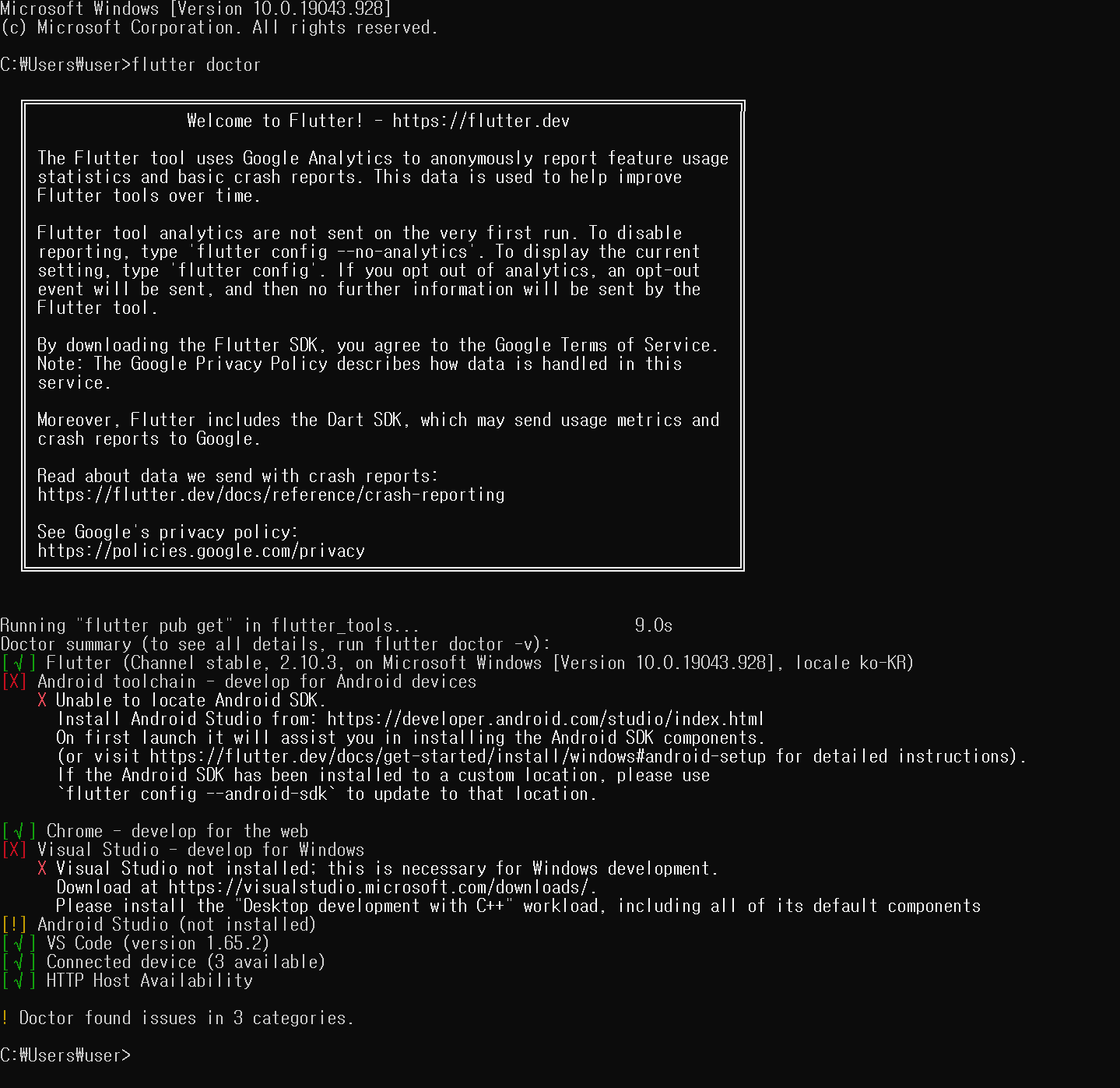 flutter doctor 를 입력하면,