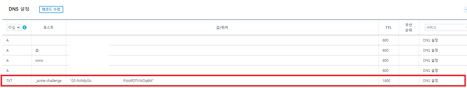 위와 같이, _acme-challenge 를 설정하고, 값에는 위에 생성된 레코드 값을 저장한다. 그리고 쌍따옴표를 앞뒤로 감싸한다.