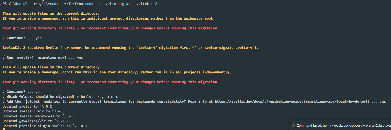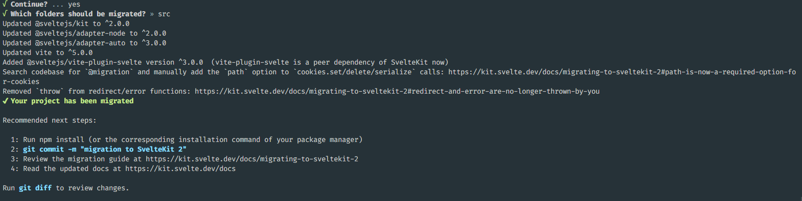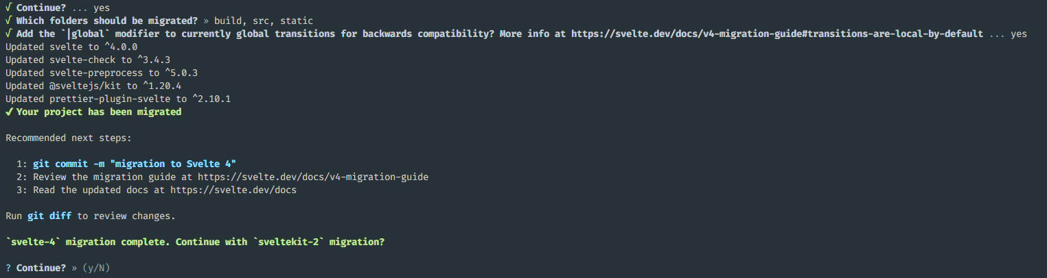 svelte4에 대한 마이그레이션이 모두 완료되고, sveltekit2 버전에 대한 마이그레이션을 계속 진행하겠냐는 문구가 노출됩니다.