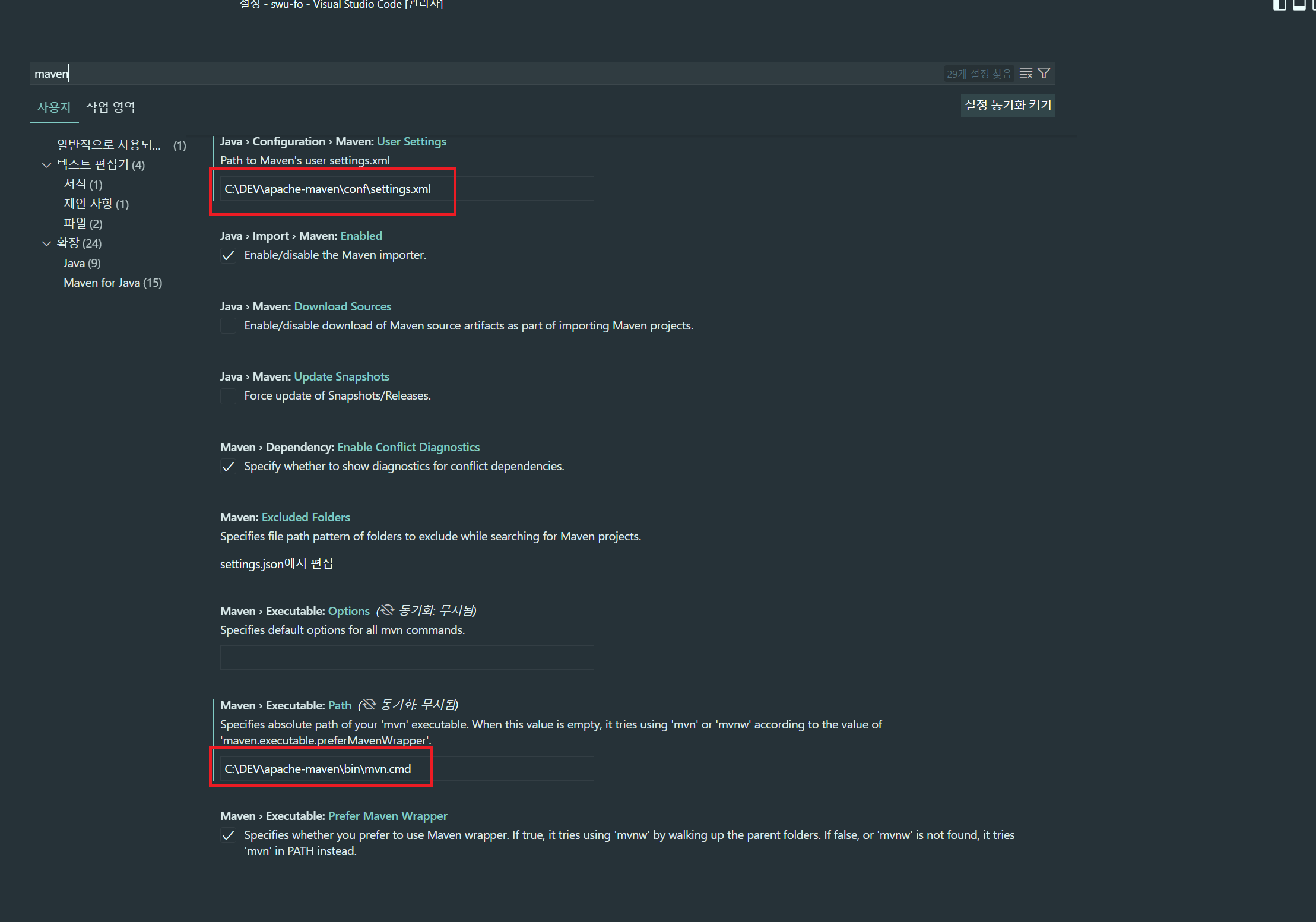이 후 설정탭에서 위와 같이 설정하면, MAVEN 기능을 사용할 수 있다.